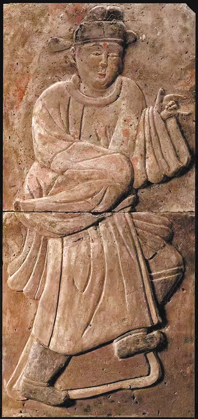 中华文化的形成与发展始终伴随着对外来文化的借鉴与吸纳。五代冯晖墓出土的50多块彩绘浮雕砖也是本次展览的一大亮点。浮雕砖上栩栩如生地刻画出28名男女艺人演奏的场景,其中有两名着男装、戴幞头的女性舞者,她们穿长袍、束腰带、蹬乌靴,姿态活泼奔放。正如《唐书·五行志》记载:“天宝初,贵族及士民好为胡服胡帽,妇人则簪步摇钗,衿袖窄小。”唐朝将境外西北部游牧民族和外国人统称为“胡人”,紧身、圆领、开衩的胡服形制在长安等地风行一时。此时期唐朝女子也出现了戴胡帽、穿胡服、着男装等现象,展现了唐朝女性独立、时尚的特点和追求自由、平等的心态,也反映出唐朝对外来文化的开放与包容。