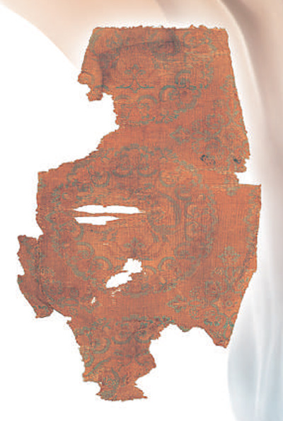 窦师纶是唐代长安著名丝织工艺家和设计师,他受西域文化影响较深,在蜀锦织造工艺基础上吸收中亚、西亚等地的“联珠团窠”纹样特色,结合动物纹样,设计出一种融合中原传统艺术与西域艺术特色的新型团窠纹样,因窦师纶受封陵阳公,故人称“陵阳公样”。它成为唐朝服饰的经典图案,其后流行200余年,在丝绸之路上掀起一阵“大唐热”。唐代张彦远在绘画通史《历代名画记》中记载:“窦师纶,官益州大行台,兼检校修造。凡创瑞锦、宫绫,章彩奇丽,蜀人谓之‘陵阳公样’。”对照本次展览中的“对凤宝花纹锦”及锦纹复原图,人们可以清晰地看到这件具有典型多元文化风格特征的“陵阳公样”实物。该织锦纹样外圈以花瓣做样,形成圆形窠环,以花卉包围一对凤凰,它们姿态昂扬,仿佛争奇斗艳,又似相互吸引。