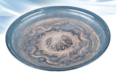 唐时,长安城内商贾云集、邸店林立,金银器、宝石、琉璃、香料和丝绸、瓷器、茶叶等西来东往的货物在此中转交易。本次展览中,一件出土于法门寺地宫的“八瓣团花纹描金琉璃盘”吸引参观者纷纷驻足欣赏。这件造型精美的蓝色琉璃盘产自地中海东岸,经丝绸之路来到中国。它盘沿外折、腹壁斜收、盘底心凸起,盘内布满纹饰,中心为八瓣蕉叶状围成的团花,巧妙运用刻纹、釉料彩绘、描金等多种工艺,彰显东西方审美碰撞交融下的和合之美。与琉璃盘一同出土的琉璃器皿中,有的具有东罗马元素,有的体现波斯风格,显示出唐朝对异域文化的开放、包容与欣赏。